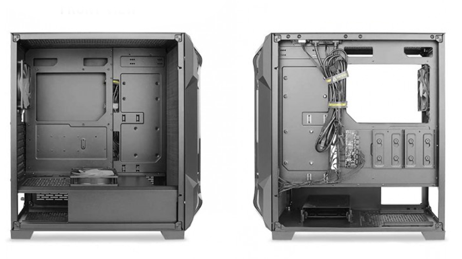 Le panneau latéral en verre du DF600 FLUX ARGB affiche un aspect très propre. Sur le côté opposé se trouve un panneau en acier massif avec un grand évent sur le fond. Cela permet à l’air froid de pénétrer par le côté et le ventilateur inversé du boîtier dirige ensuite le souffle vers le haut. Les composants au-dessus de l’alimentation comme la carte graphique sont alors mieux refroidis.