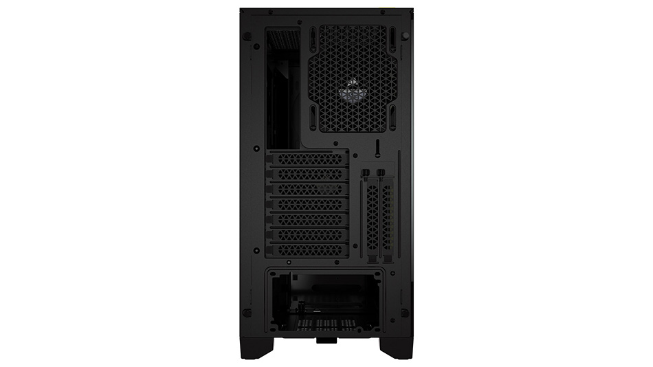 Le Corsair 4000D Airflow inclut un filtre à poussière magnétique au sommet et supporte des radiateurs de 240 mm ou 280 mm en haut. Compact, mais polyvalent, il propose un ventilateur arrière de 120 mm ajustable et sept emplacements PCI amovibles. Avec ce modèle, il est possible de monter en vertical la carte graphique (limité à deux slots). L’alimentation (PSU) peut être installée vers le haut ou le bas, avec un montage par l’arrière. En ce qui concerne l’interface frontale, on a un bouton Power, un port USB 3.2, un USB-C et un jack micro-casque.
