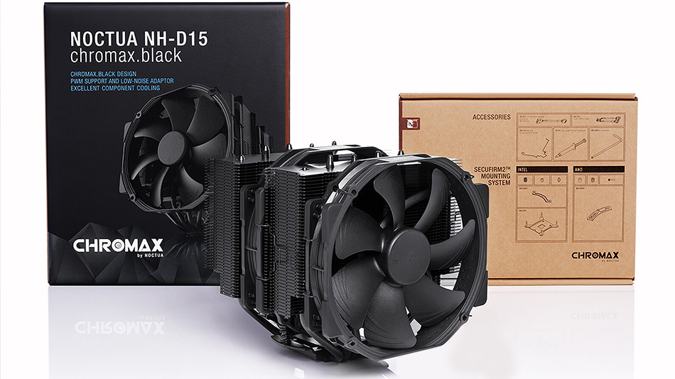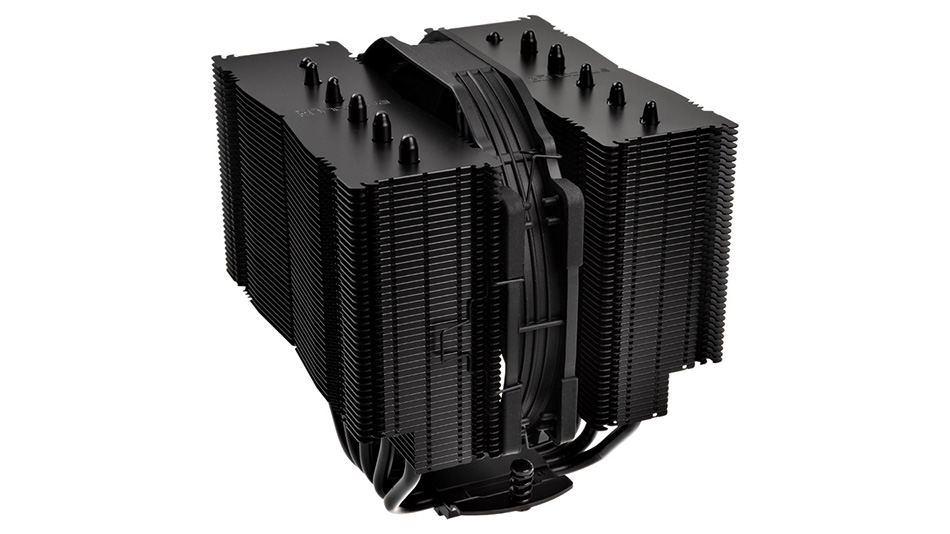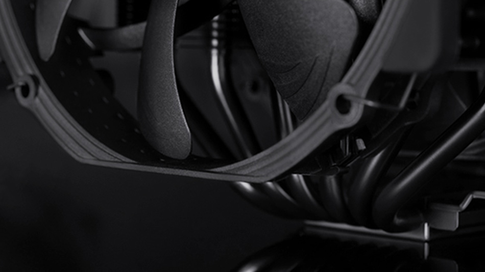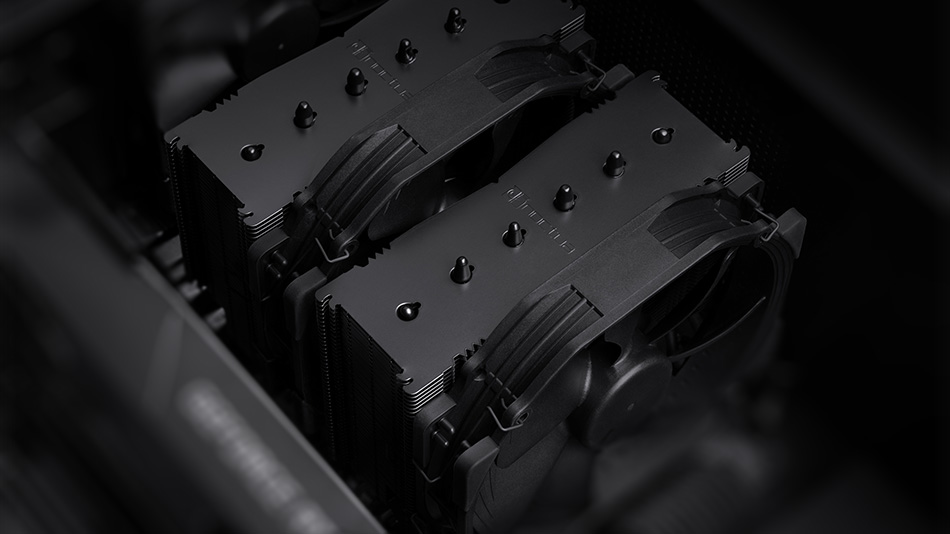 Le Noctua NH-D15 Chromax Black est un refroidisseur à air haut de gamme. Avec ce modèle, le constructeur utilise 2 ventilateurs NF-A15 HS-PWM chromax black. L’un des deux est pré-attaché au dissipateur thermique et les deux s’évaluent à 1500 rpm pour un maximum de refroidissement. Les ventilateurs avancent jusqu’à 140,2 m³/h de débit d’air avec une sortie sonore maximale de 24,6 dB (A). Ils embarquent également des coussinets antivibrations amovibles.