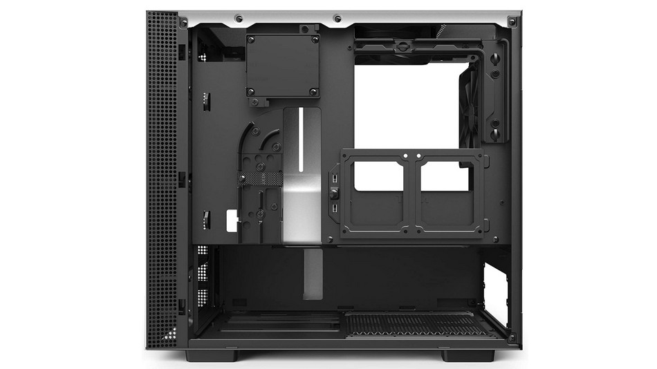 À l’intérieur du NZXT H210i, il y a suffisamment de place pour les ventilateurs ou les radiateurs montés (uniquement à l’avant). On peut ajouter jusqu’à 2 ventilateurs de 120 mm sur la façade de devant. Néanmoins, il reste possible d’installer des ventilateurs de 140 mm. L’utilisateur peut également employer un AIO ou un radiateur de 240 mm sur ce côté. Le haut du H210i affiche une seule ouverture où un ventilateur de 120 mm est préinstallé. Entre autres, le châssis peut embarquer les meilleures cartes graphiques d’un maximum de 325 mm et un refroidisseur de processeur d’une hauteur de 165 mm.