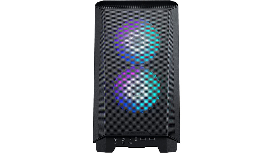 Le boîtier Mini-ITX Eclipse P200A se distingue par sa conception qui ressemble davantage à celle d’un boîtier MicroATX. Sa grille avant en acier favorise la circulation de l’air tout en filtrant partiellement la poussière. Le panneau de droite, également en acier, dispose d’une ouverture pour l’entrée d’air tandis que le panneau latéral gauche est en verre trempé. Ceux-ci sont fixés par des clips à des billes métalliques, un mécanisme robuste et facile à manipuler lors du retrait des panneaux. Le panneau d’E/S avant présente le bouton d’alimentation et une prise casque, deux ports USB 3.0 Type-A, un port USB Type-C et deux boutons de contrôle pour les LED RVB.
