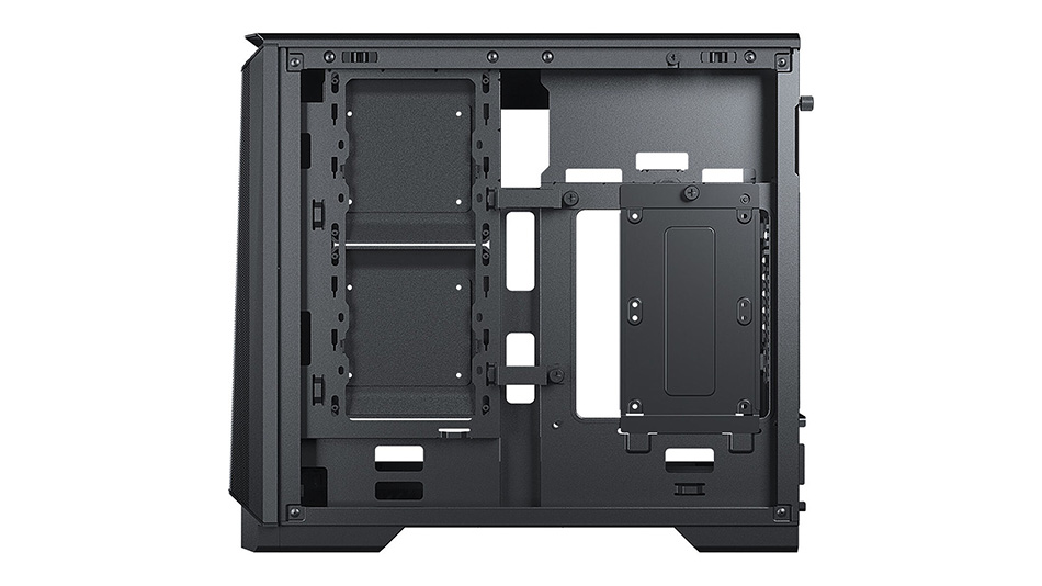 Le point fort de ce boîtier est au niveau de la carte graphique. Il y a trois supports de carte additionnels installés au fond du boîtier. Cela permet au châssis d’accueillir des cartes graphiques à triple emplacement de grande taille. L’installation du radiateur ou des dispositifs de stockage sur le côté limite l’espace pour la carte graphique. Seule une carte Mini-ITX y trouvera sa place. Par ailleurs, le montage vertical de la carte graphique est possible grâce à une carte pivotante.