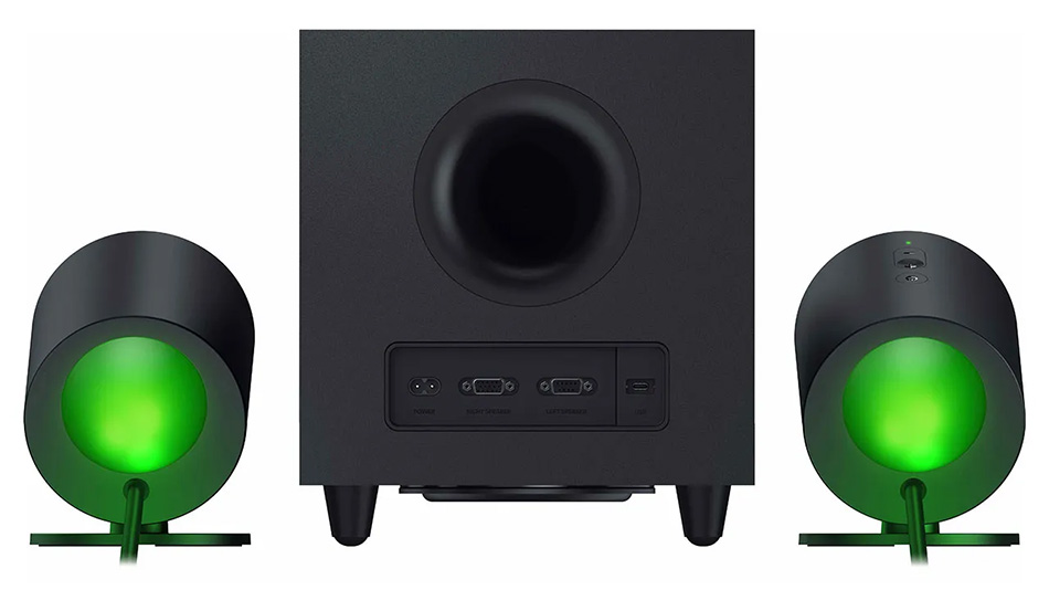 Le Nommo V2 Pro adopte un design plus compact que son prédécesseur, avec des enceintes principales mesurant 18,5 cm de hauteur. Leur finition noire mate attire facilement les empreintes digitales, mais reste élégante sur un bureau. Sur ce modèle, chaque enceinte est inclinée à 20 degrés pour optimiser la projection sonore vers l’utilisateur. À l’arrière, un dôme translucide de 8,3 cm diffuse l’éclairage RGB, offrant des effets visuels personnalisables. Pour ce qui est du caisson de basses, il adopte une forme cubique (26,5 cm de côté) avec une finition texturée anti-traces. Ici, il n’y a pas de boutons physiques, il se contrôle entièrement via le logiciel Razer Synapse ou le pod sans fil.